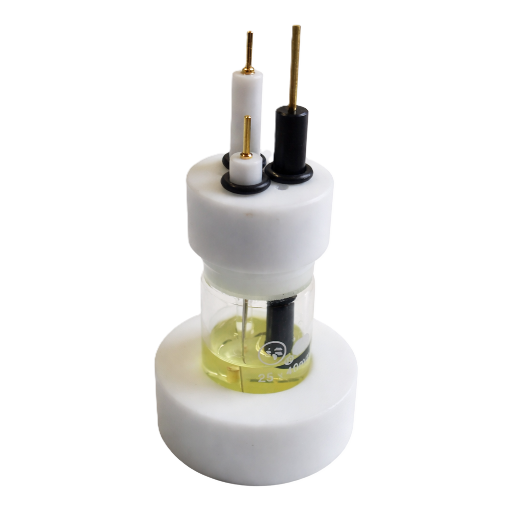 玻璃样品池是一个简单的 25 mL 容器(25 mm x 40 mm),带有接头。如果不使用样品池,玻璃点火器可防止蒸发。