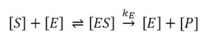 To characterize biosensors the Michaelis-Menten constant is an important factor. To understand why it is important and where it derives from one has to understand the observations and theories of Michaelis-Menten. This model is still the most used one for enzyme kinetics. An enzyme E is a catalyst that converts its substrate S, a term for the reagent converted by the enzyme, into the product P or products. To perform a substrate selective reaction the substrate and enzyme have to form a complex ES. It can be assumed that the concentration of ES is in a dynamic equilibrium with the enzyme E and the substrate S. The limiting step in this reaction is the conversion of ES to E and P and usually the equilibrium on the side of the product is very strong. The enzymatic reaction is expressed by: