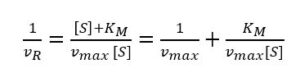 During an amperometric measurement we can control the concentration of substrate [S] and we measure the vR as the current I. The unknown values of equation 3.9 are the two values we want to evaluate: vmax and KM. Scientists like to turn an equation into a linear form, because this often allows a good determination of missing parameters via a linear fit. If equation 3.9 is inverted, a linear form can be achieved: