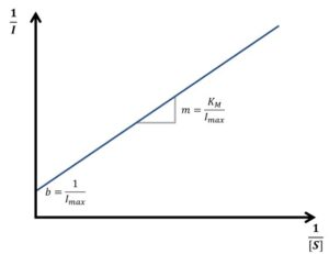 Equation 3.10 is known as the Lineweaver-Burk equation. According to the Lineweaver-Burk equation, a plot of 1/vR versus 1/[S] should deliver a line with the intersection 1/vmax and slope KM/vmax. Such a plot is called a Lineweaver-Burk plot, but in an amperometric experiment 1/I is plotted versus 1/[S] (see Figure 3.2).