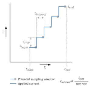 The scan rate is specified in current per time (i.e. µA/s), which determines the time between two steps and thus the sampling time. The interval time is ‘i step’ / ‘Scan rate’. I.e.: when ‘i step’ is 0.005 mA and the scan rate 0.1 mA/s the interval time is 0.05 s.