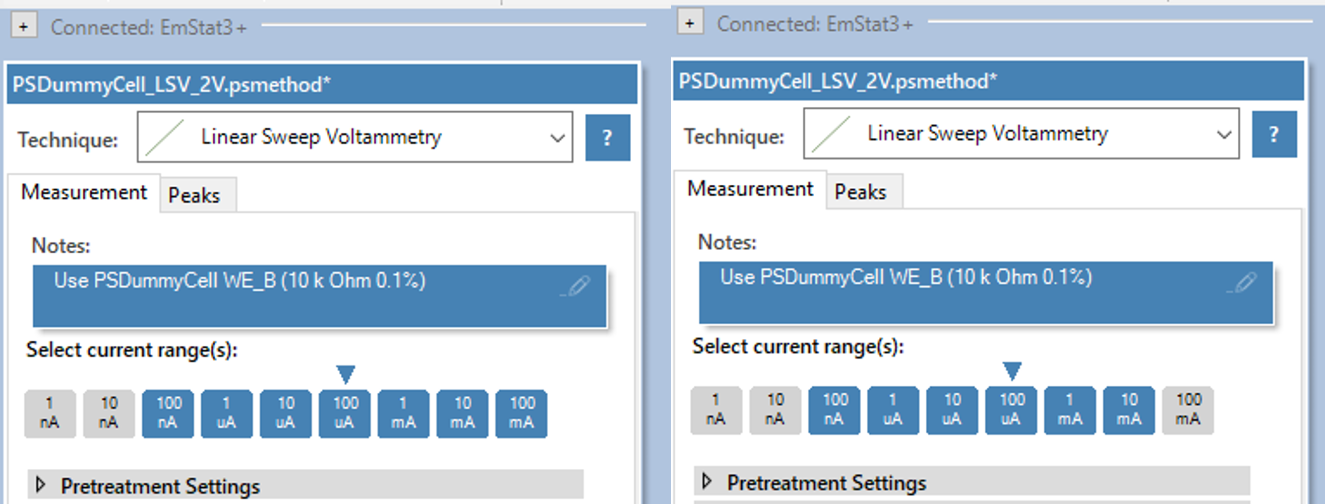 Because the sense lead is only used when the 100 mA is active, the EmStat3+ is not recommended for 4-electrode measurements.