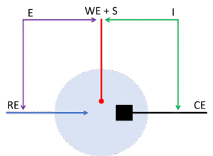 This way the potential drops across the counter or working electrodes’ interfaces and thus the corresponding reactions are not contributing to this measurement. Only processes across the solution and obstacles, for example, a membrane, between the sense and the reference electrode contribute.