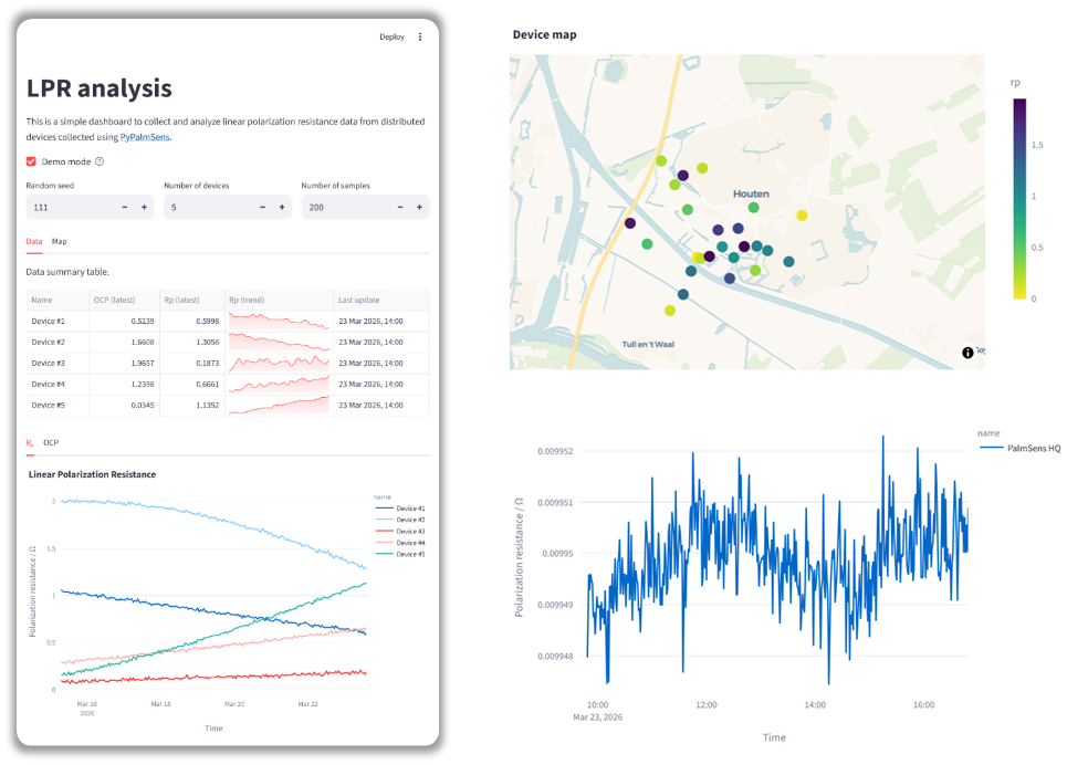 The goal for this application note is to show how to set up a remote IoT system for corrosion sensing using a PalmSens potentiostat coupled to a low-power single-board computer for connectivity. The idea is to have multiple of these 'in the field' attached to wind turbines, bridges, or other corroding infrastructure and monitor them via a central dashboard. The dashboard can be used to monitor corrosion rate over time.