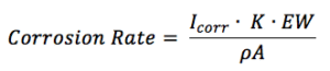 The corrosion rate in mm/year can be calculated according to the standard practice described in the ASTM Standard G 102. To calculate an estimation of corrosion the corrosion current as well as the following material parameters are needed: equivalent weight EW in g/mol, the density ρ in g/cm3, and the sample area A in cm2 of the study sample. Combined with a constant (K) defined by the ASTM (3272 mm/(A*cm*year*mol)) this information is used to determine the corrosion rate in mm/year according to equation 5.3.