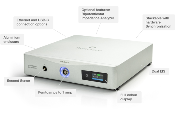 정확한 저전류 측정을 위한 최고 수준의 솔루션을 제공해 온 PalmSens전통을 바탕으로 개발된 Nexus는 기존 휴대용 디바이스를 능가하는 초저소음 성능을 제공하는 동시에 최대 1암페어까지 측정할 수 있습니다.