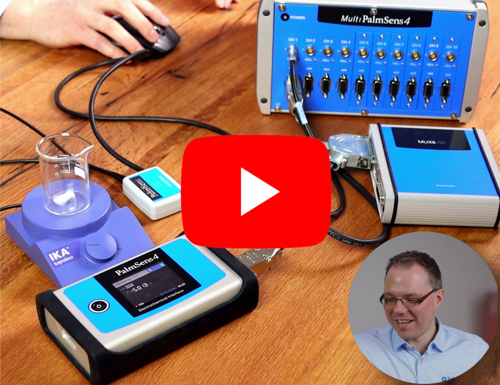 Extremely convenient magnetic mini-stirrer for mixing quantities up to 250 ml. This stirrer comes with a switch box for your PalmSens enabling your potentiostat to control the stirrer. The stirrer is automatically used during the depositing phase or for example switched on or off by using a script in the scripting window for a user defined time during the measurement.