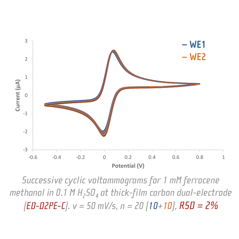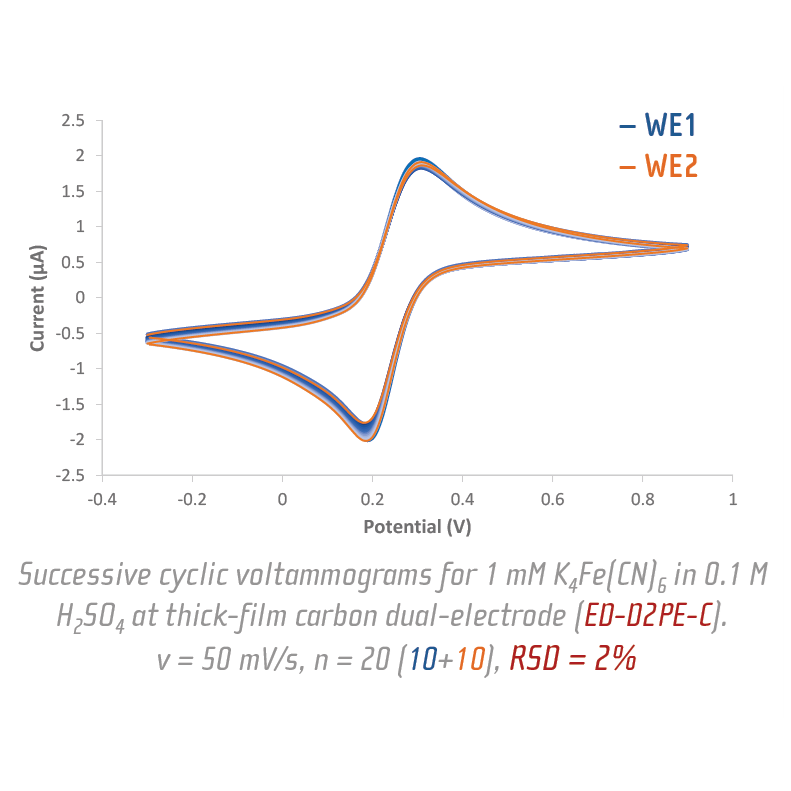 Dual screen-printed electrodes are based on a four-electrodes approach with two working electrodes (WE1 / WE2), sharing a reference (RE) and an auxiliary (counter) (AE or CE) electrode independent from the RE. A very affordable solution suitable for the development of multiplexed chemical-sensors and bio-sensors for field analysis.