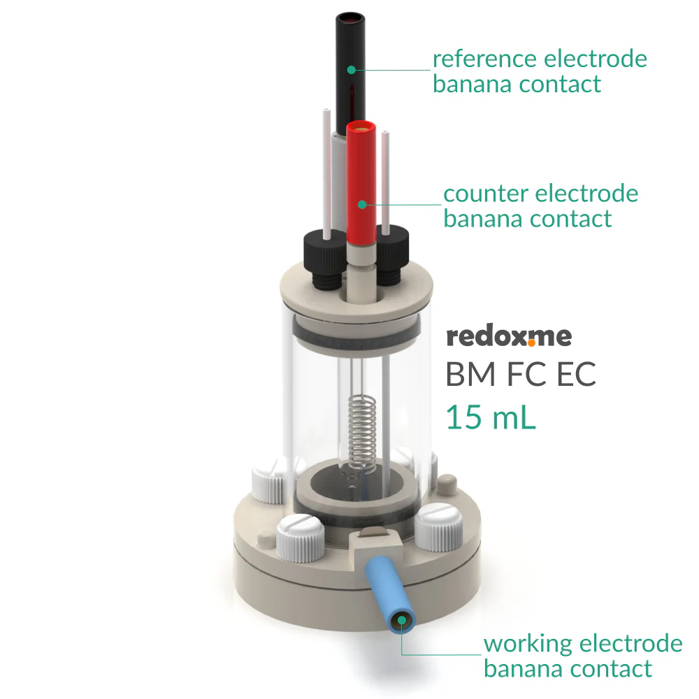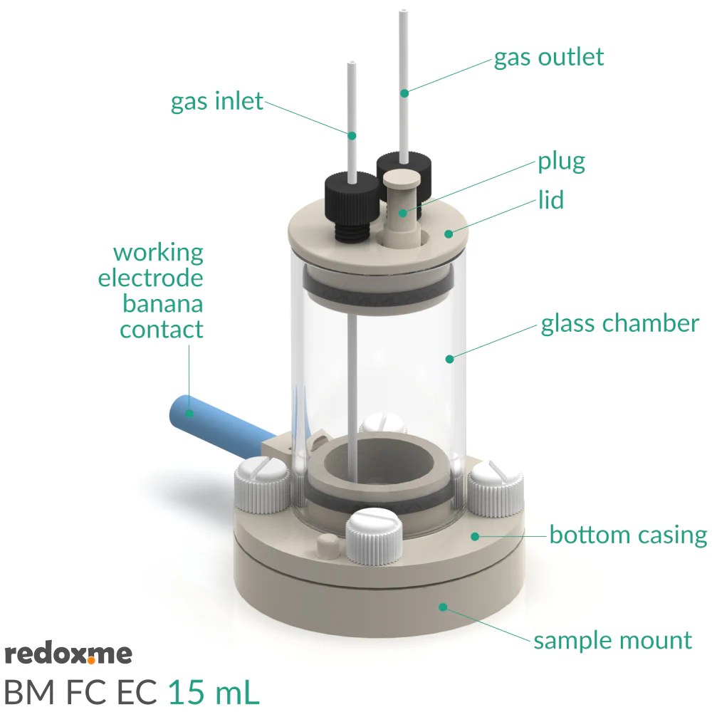 This is a static voltammetry cell with variants for different sample dimensions. The sample is loaded from the bottom via screw mount, while counter or/and reference electrodes are mounted in the lid as either 2-, or 3-electrode configuration. The cell is constructed with materials that are inert to the sample environment (glass and PEEK), and it can be used with FKM/EPDM O-rings or FFKM O-rings for aqueous or organic electrolyte requirements respectively. The construction is gas-tight and inert gas can be bubbled through the electrolyte to remove and exclude contaminants such as air or water.
