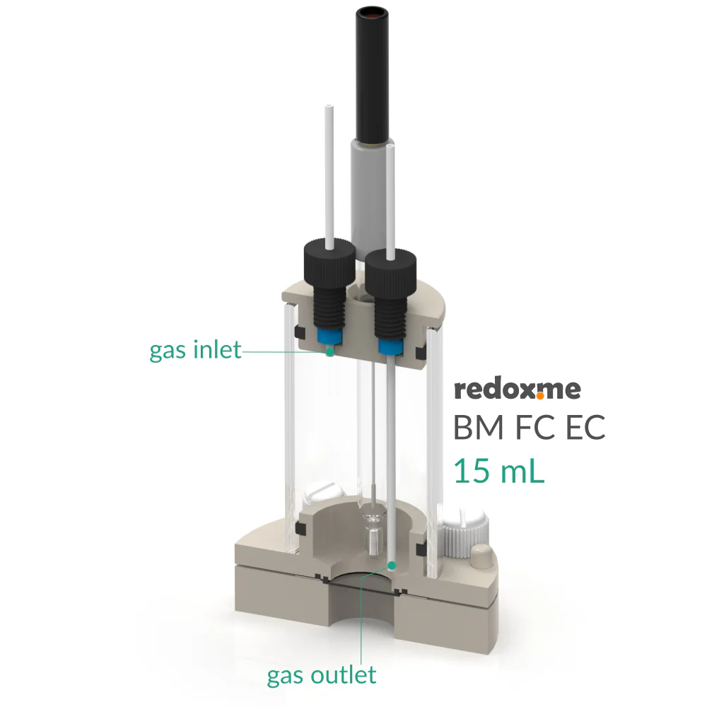 The reference electrode tip should be placed close to the sample surface to ensure a negligible potential drop throughout the electrolyte solution during low-current experiments. Various auxiliary electrodes are suitable for this cell including metal wire and metal plate electrodes as well as carbon-based electrodes (graphite or Glassy Carbon). If a purge gas is used, stop the flow during experiments for better results. For troubleshooting instruction see the redox.me blog post.