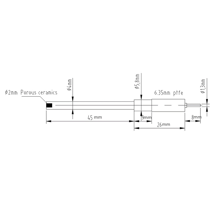 This is a reference electrode with a silver wire enclosed within a glass tube terminated with a 2 mm ceramic frit. It comes filled with an aqueous KCl 3 mol/L aqueous solution.